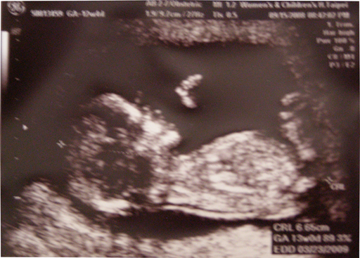 檢查30分鐘後,宣布答案唐氏症機率是1/16648非常正常,而且預產期跟黎醫生說的一樣,都是在3/26(正好是我們結婚三周年說)不過媽媽有項血液檢查值偏低,未來可能會有生長遲滯的狀況,所以媽媽還是要很小心,希望小牛多合作,吃多點、吸收好一點,別讓媽媽擔心耶!